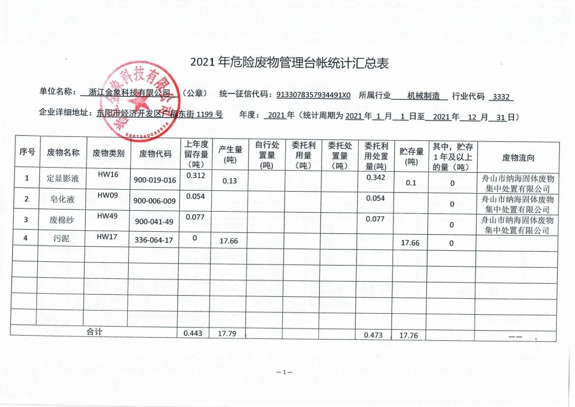 2021年浙江金象科技有限公司固體廢物污染防治信息公示