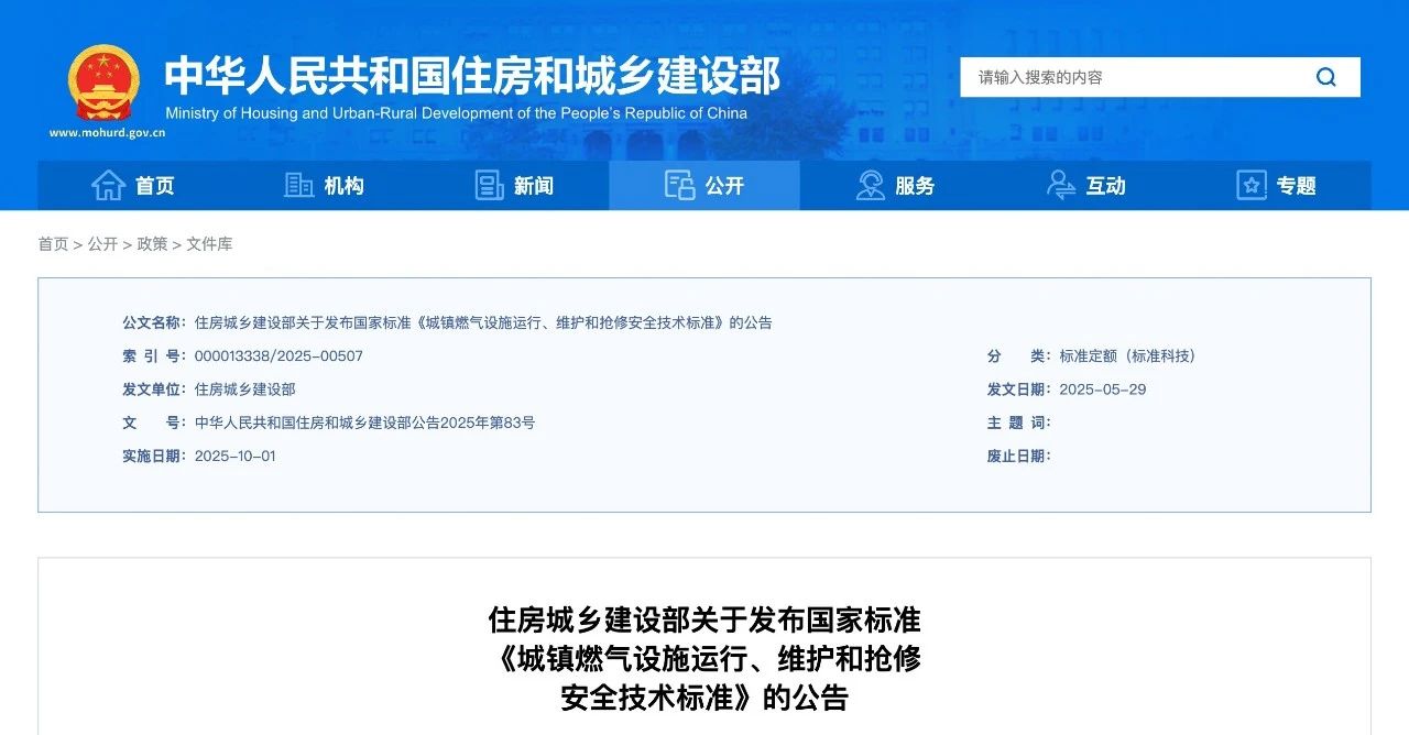 現(xiàn)批準《城鎮(zhèn)燃氣設施運行、維護和搶修安全技術標準》為國家標準,編號為GB/T51474-2025,自2025年10月1日起實施。原行業(yè)標準《城鎮(zhèn)燃氣設施運行、維護和搶修安全技術規(guī)程》(CJJ51-2016)同時廢止。